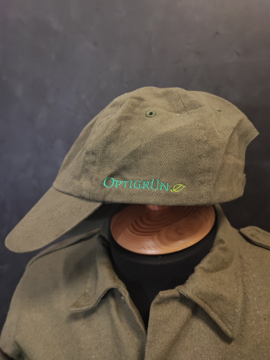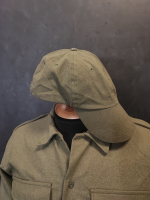 Бейсболка в оливковом цвете универсального размера с жестким козырьком.