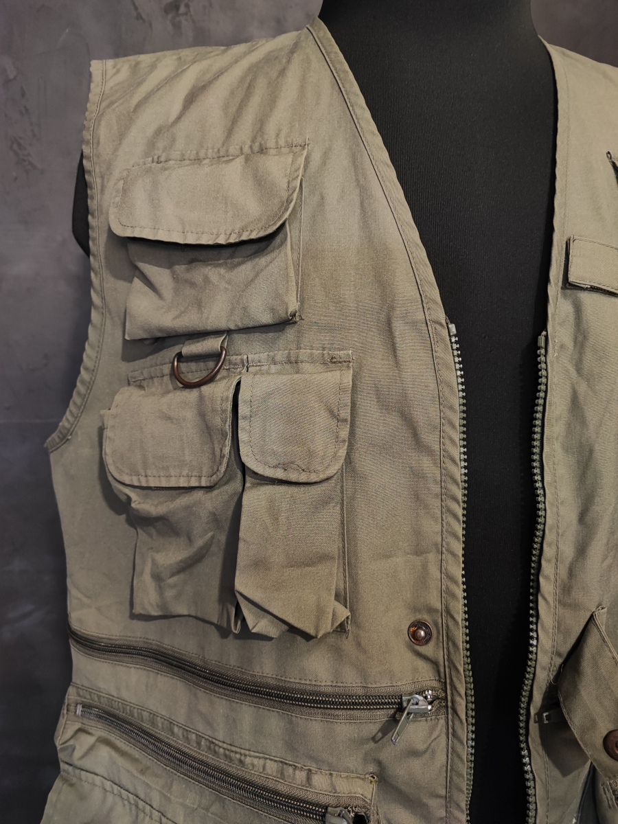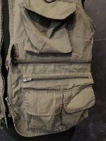 Жилет с большим количеством карманов для любителей рыбалки и охоты в цвете олива.