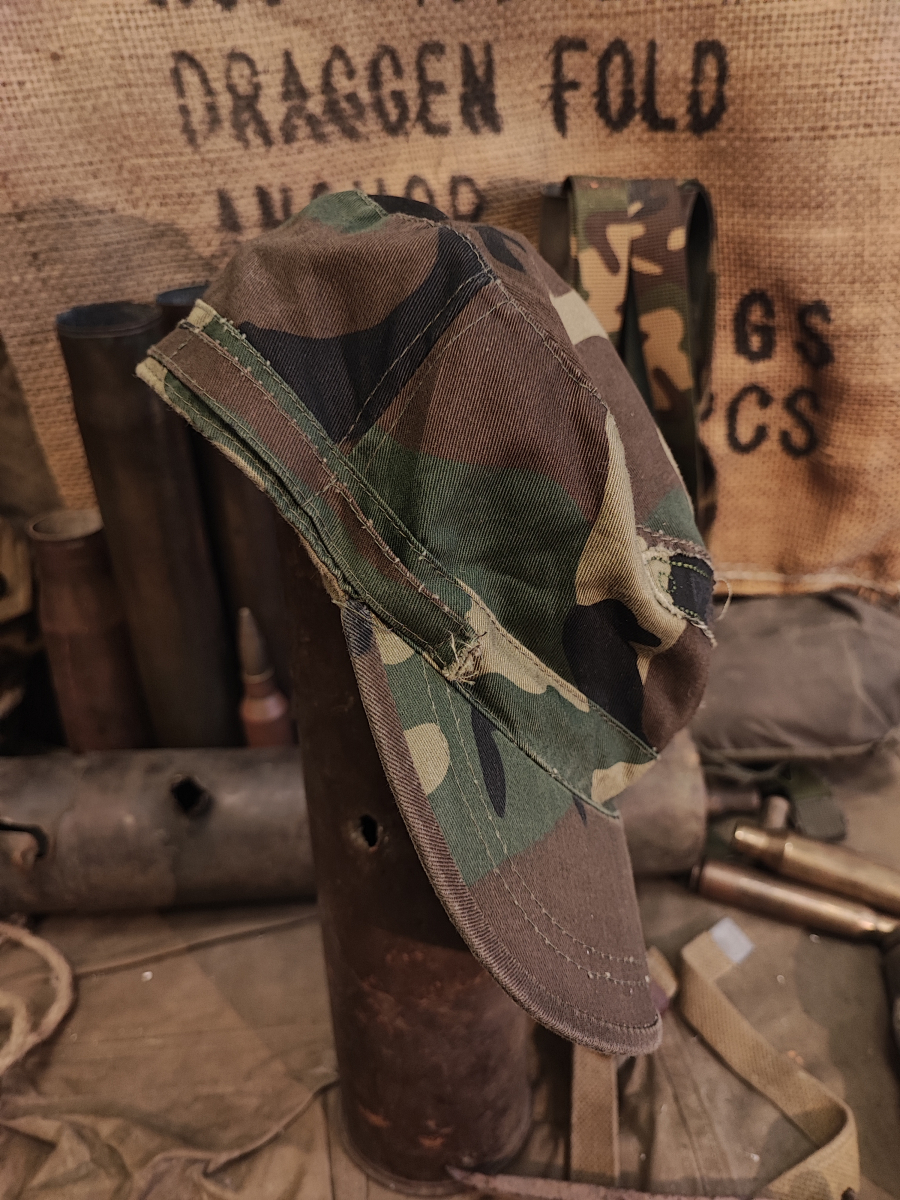 Кепи BDU в камуфляже Woodland с жестким прошитым козырьком и регулировкой объема на липучке.