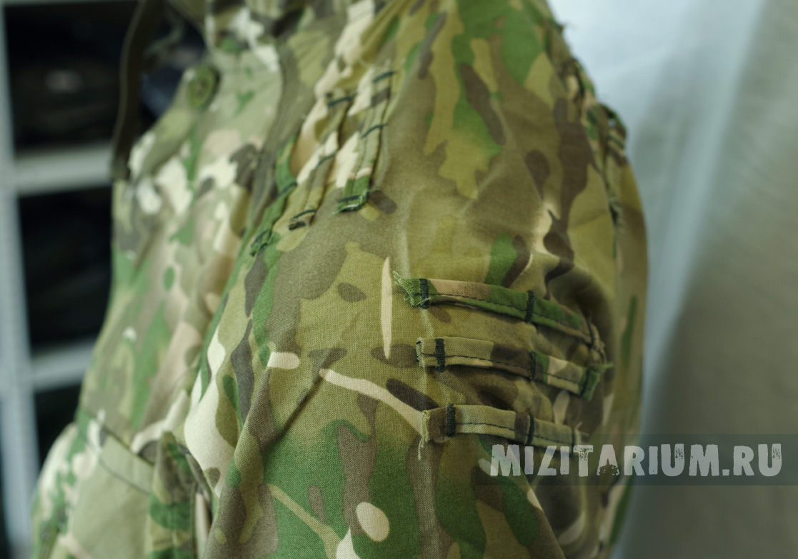 На плечах с каждой стороны располагаются по девять шлевок для крепления дополнительной растительной маскировки, прочно пришитых на спецзакрепочной машине. С боку по линии талии и в низу рукавов расположены эластичные стяжки (резинки), маскировочные манжеты при необходимости убираются под эту резинку, внутрь рукавов.