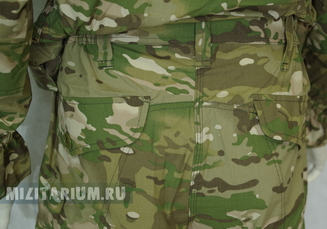 Спина цельновыкроенная с верхней частью переда и рукавов, что обеспечивает лучшее использование маскировочных свойств рисунка камуфляжа и обеспечивает комфорт при ношении бронежилетов и рюкзаков большой массы (швы не натирают спину и плечи сотрудника, боковые стяжки не препятствуют вентиляции спины).