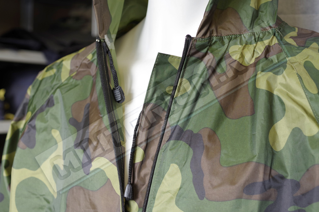 Плащ с застежкой на молнию и ветрозащитной планкой, имеет капюшон, герметично проклеенные швы, манжеты на рукавах, вентиляционные отверстия в области подмышек. Объем капюшона регулируется по лицевому вырезу шнуром с наконечниками.