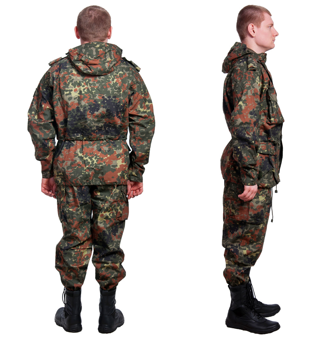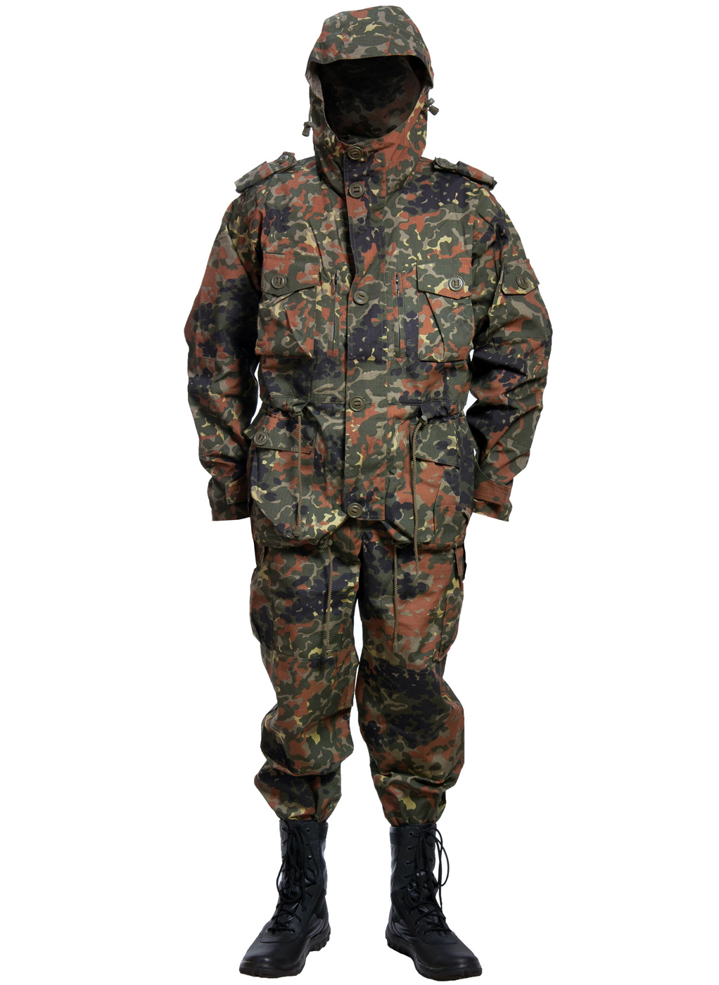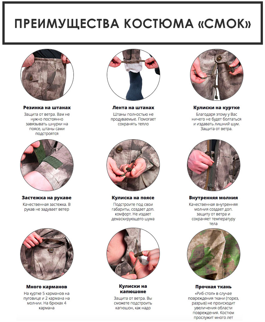 Прочная камуфлированная ткань, из которой скроен костюм, в состоянии устранить дискомфорт, причиняемый дождем или ветром. В то же время костюм не издает демаскирующего шума при передвижении. Конструкция костюма снабжена различными приспособлениями, позволяющими сделать его максимально облегающим — это способствует сохранению тепла и при этом не стесняет движений.