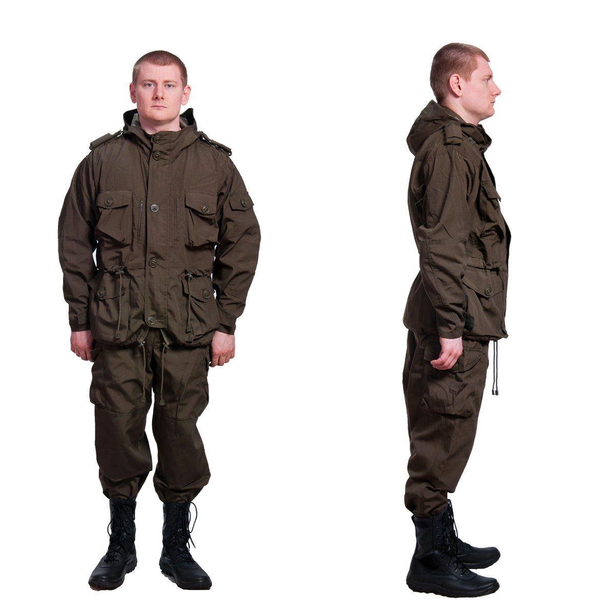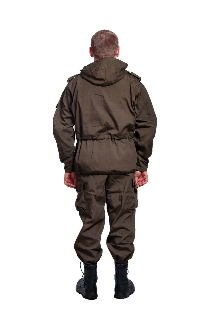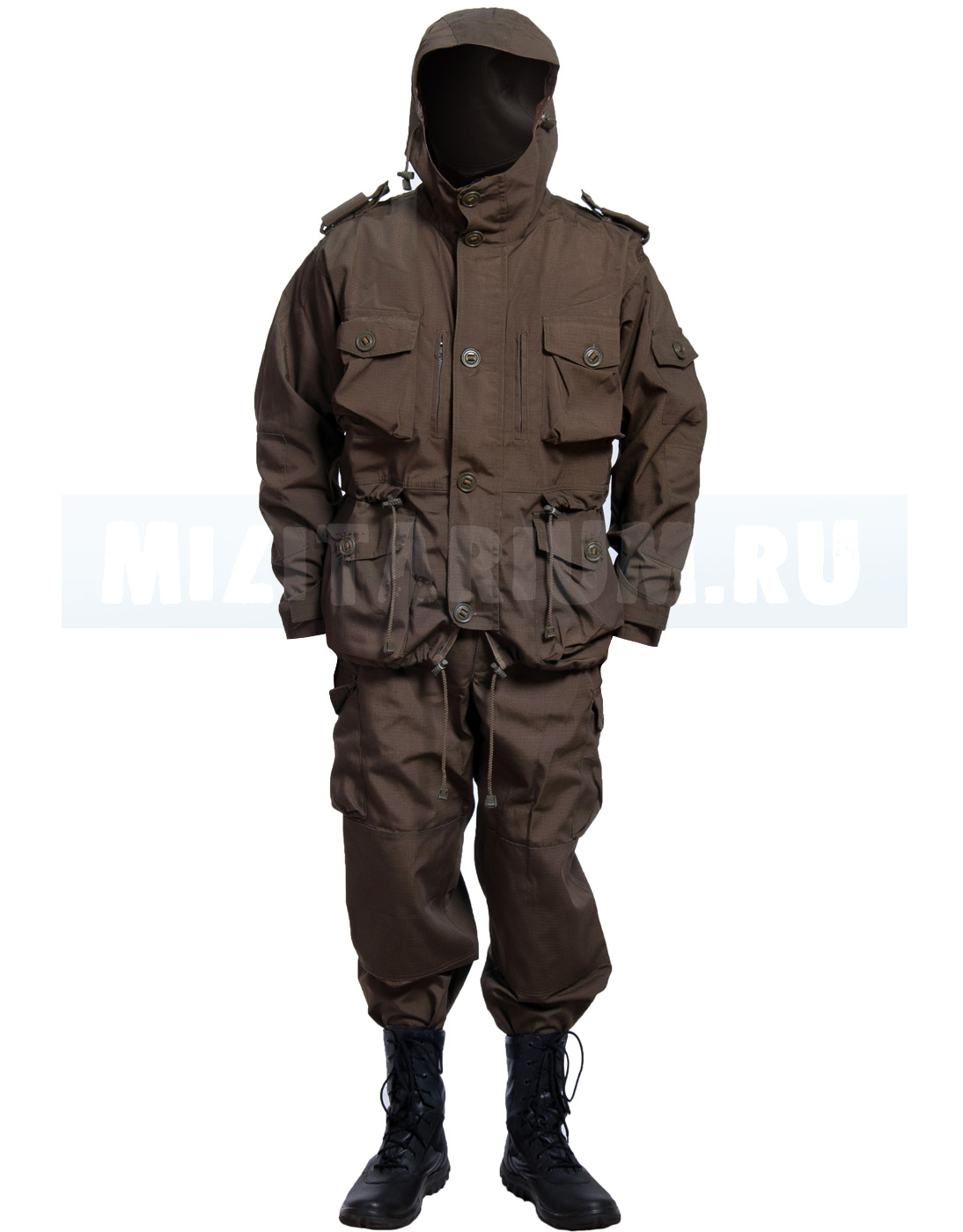 Прочная камуфлированная ткань, из которой скроен костюм, в состоянии устранить дискомфорт, причиняемый дождем или ветром. В то же время костюм не издает демаскирующего шума при передвижении. Конструкция костюма снабжена различными приспособлениями, позволяющими сделать его максимально облегающим — это способствует сохранению тепла и при этом не стесняет движений.