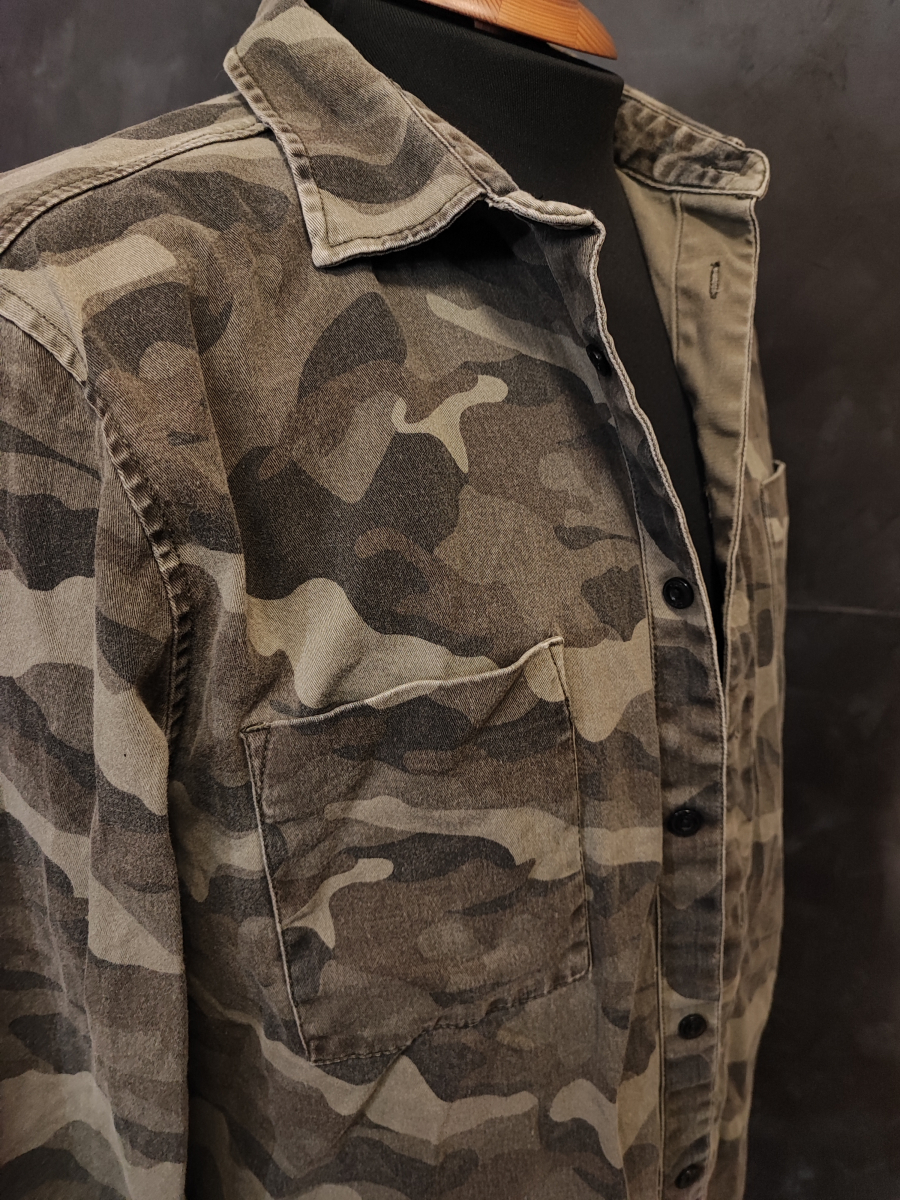 Брутальная рубашка в милитари стиле с принтом черепа на спине фирмы COOLCAT. Застегивается на пуговицы с фирменным логотипом. Плотная ткань состоит из 97% хлопка и 3% эластана.
