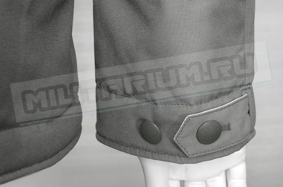 - На обшлагах рукавов имеются две пуговицы и хлястик с прорезью под пуговицу, позволяющий заузить рукав, чтобы в него не задувало.
