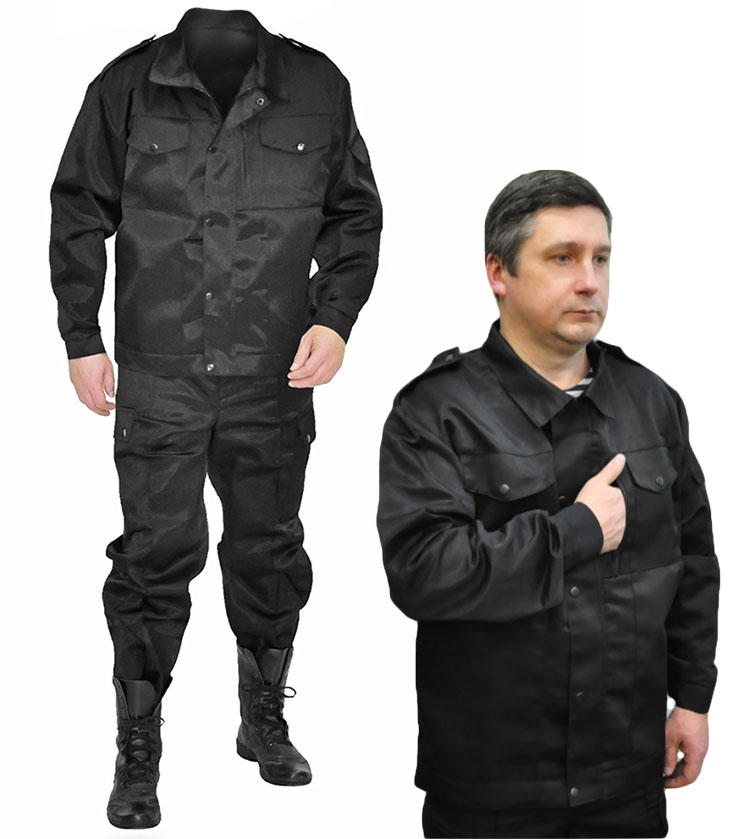 Бюджетный костюм для охранника, в черном цвете, с укороченной курткой и большим количеством карманов.