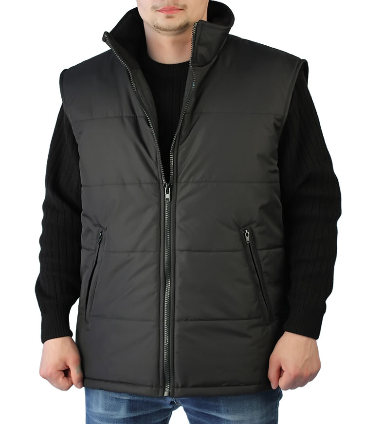 Жилет мужской, прямого силуэта, утепленный, кокетки полочек и спинки выделены отделочной тканью, нижние части - простеганы декоративными строчками с утеплителем.