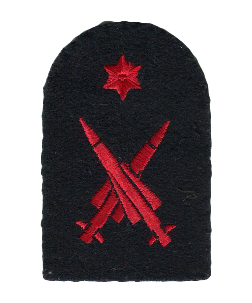 Нашивка Ракетчик Королевского флота (скрещенные ракеты) + 1 звезда - обозначает квалификационный значок для офицера Королевского флота, который завершил подготовку ракетчика и получил одну звезду, указывающую на уровень знаний или достижений в рамках этой специальности.