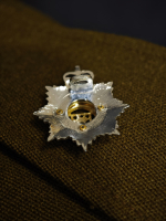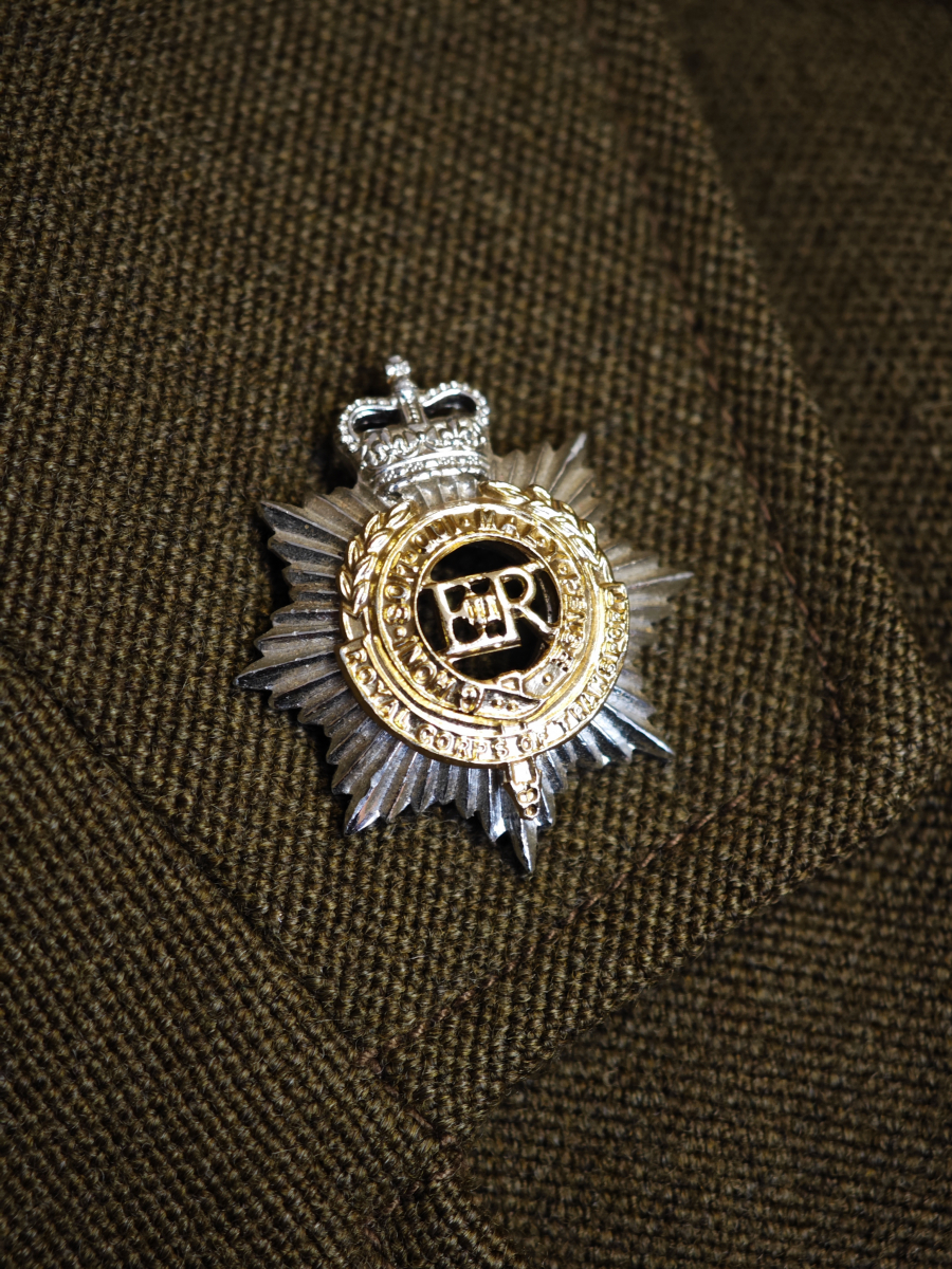 Лацканный знак Королевского корпуса транспорта Великобритании представляет собой восьмиконечную звезду Ордена Подвязки, увенчанную короной Святого Эдуарда. Эта композиция символизирует высочайший королевский статус подразделения и его верность лично монарху.