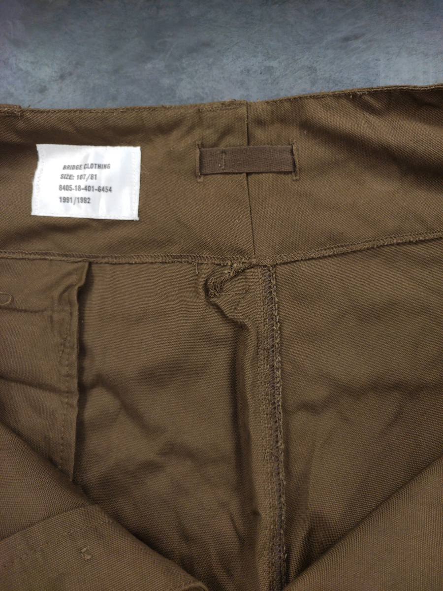 Изменение карманов было не единственным улучшением, которое претерпели брюки SADF nutria brown. Более ранние образцы сделаны из более мягкой ткани, но более подверженной зацепам и разрывам в кустах. Эти более поздние брюки сделаны из более жесткой ткани.