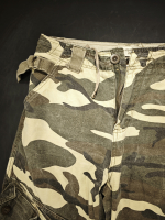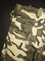 Камуфляжные хб брюки с карго карманами, декоративными элементами и завязками по низу брючин.