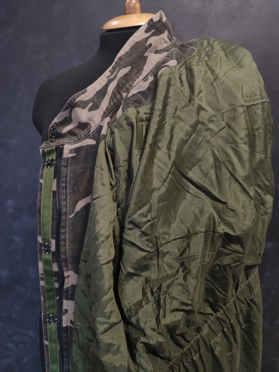 У куртки очень своеобразный фасон: за счет спущенного плеча подойдет на большую вариативность размеров.