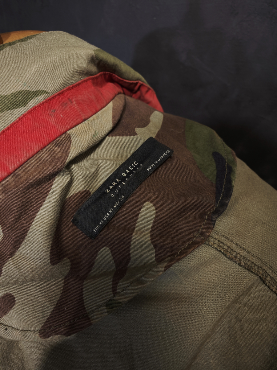 Женская куртка ZARA Basic на молнии в камуфляже с красной полосой.