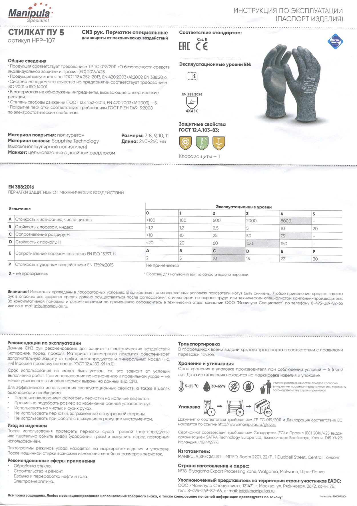Перчатки Стилкат ПУ 5 рекомендованы для защиты рук от механических воздействий (истирание, скользящие порезы, проколы) в сухих и влажных средах.