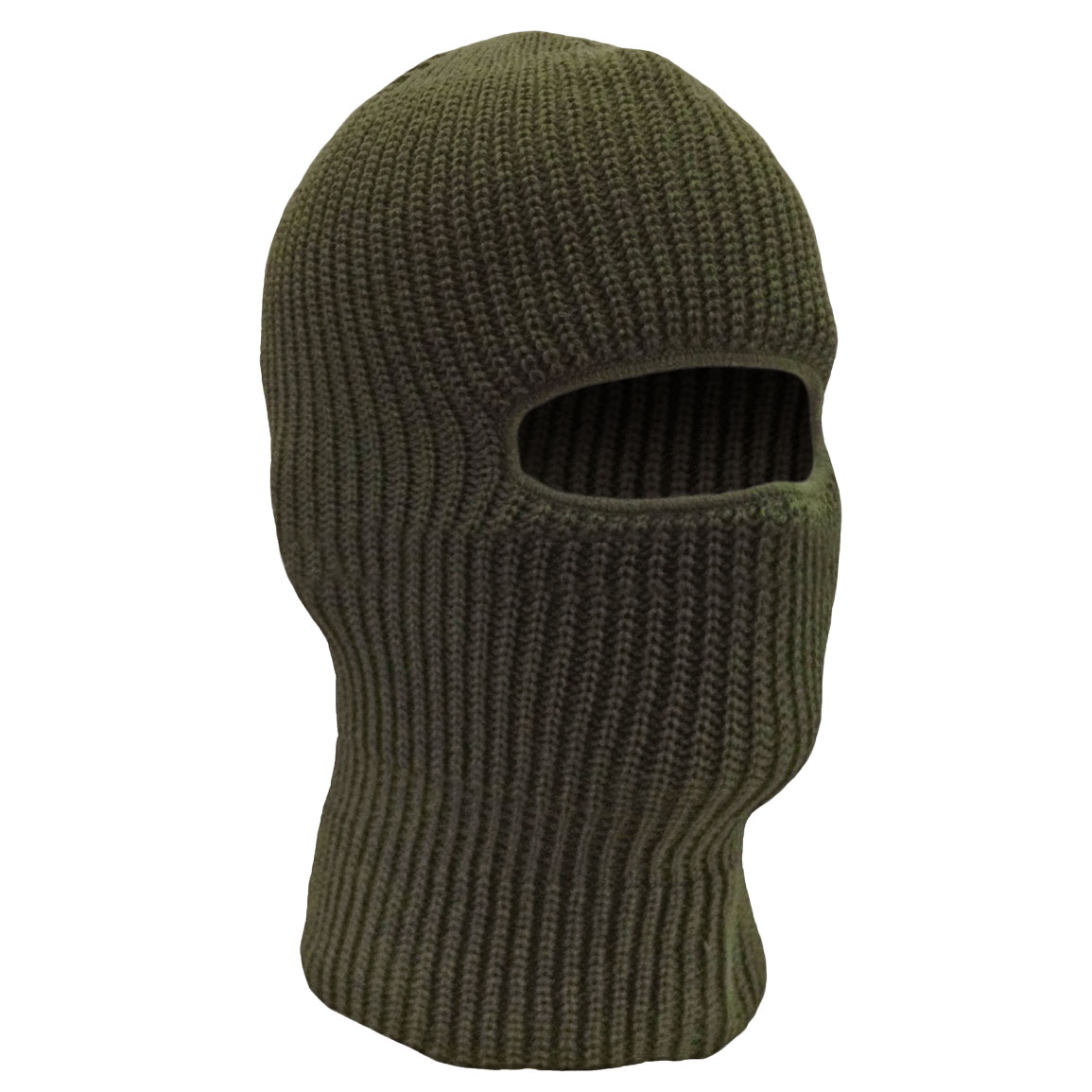 Вязаные зимние балаклавы в оливковом цвете с одним отверстием для глаз.