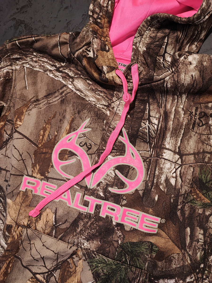 Худи женское производства Realtree в камуфляжной серии Xtra с ярким розовым принтом на груди и розовой подкладкой капюшона.
