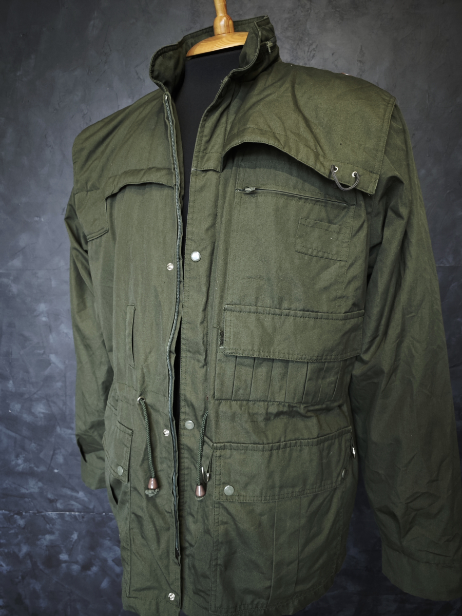 Утепленная однотонная куртка с нагрудными карманами в охотничьем стиле.