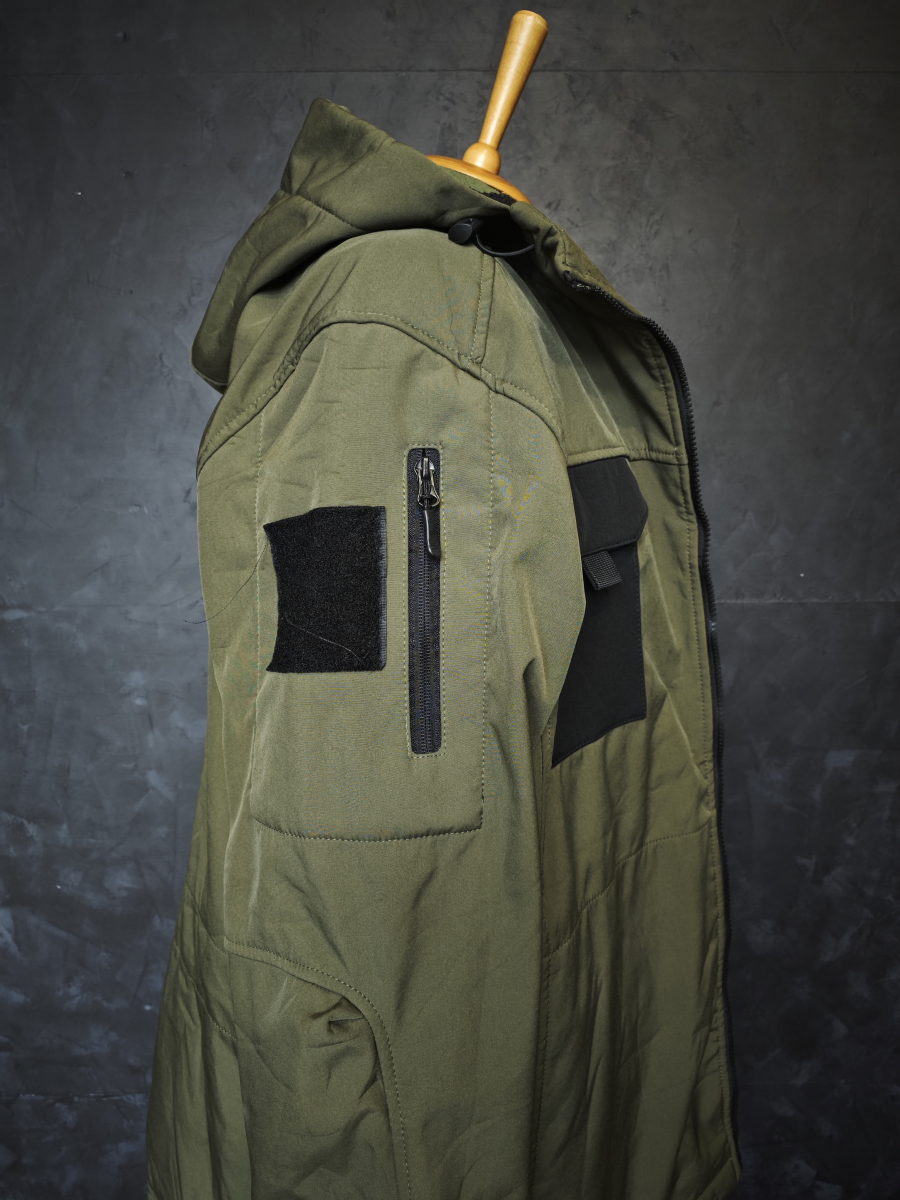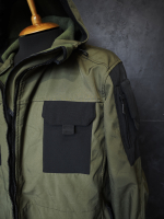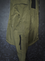 Капюшон с регулировкой, не съемный. Карманы на рукавах с молниями. Нагрудные карманы на липучках.