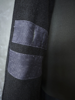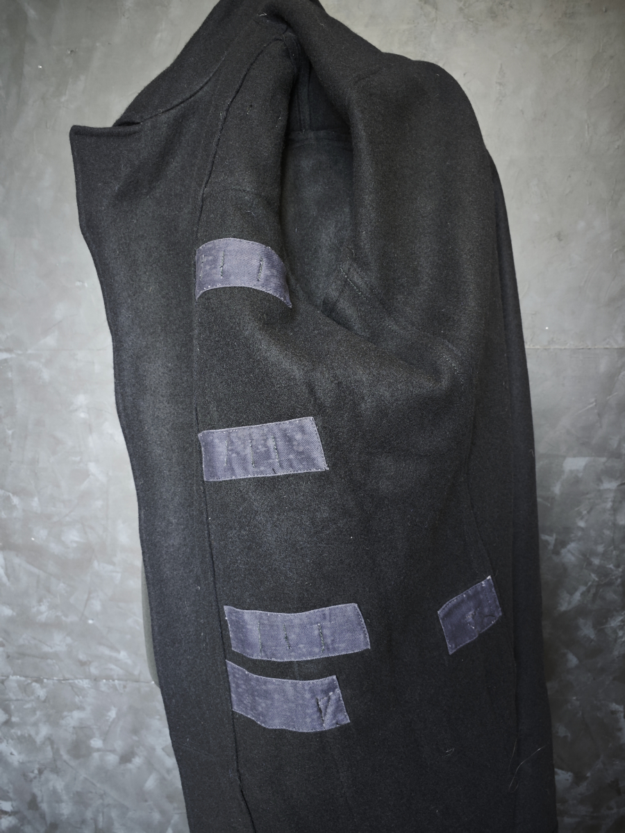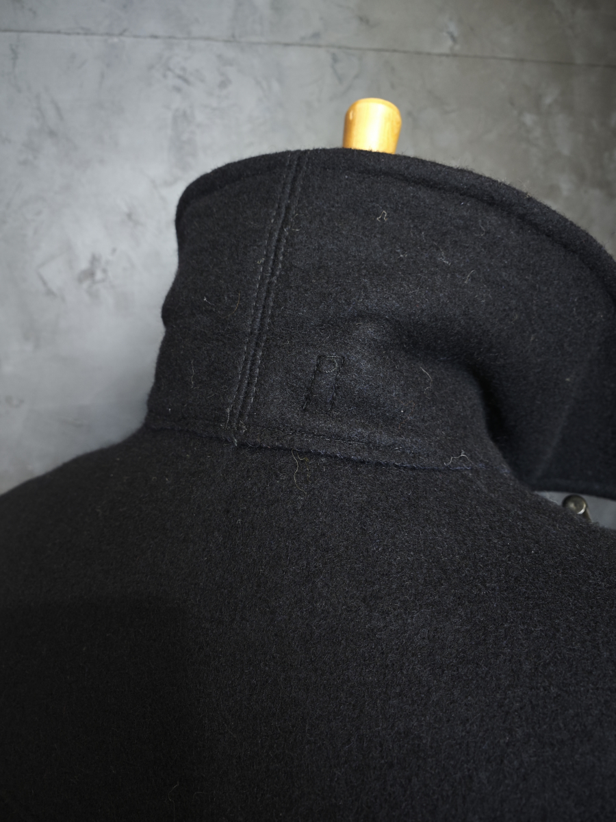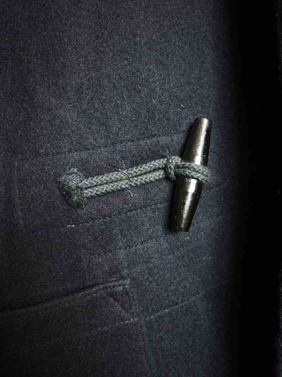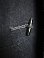 Застёжки: Верёвочные тогглы (деревянные шпеньки + петли) - фирменный элемент британской морской униформы середины XX века. Позже заменены на металлические пуговицы с якорями.