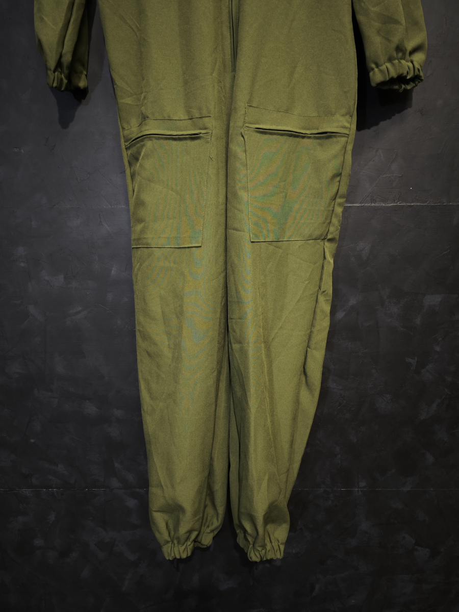 Крутой костюм летчика-истребителя для карнавала или тематической вечеринки. Оливково-зеленого цвета с карманами брюк, ложного пояса и многочисленных разноцветных нашивок в области груди.