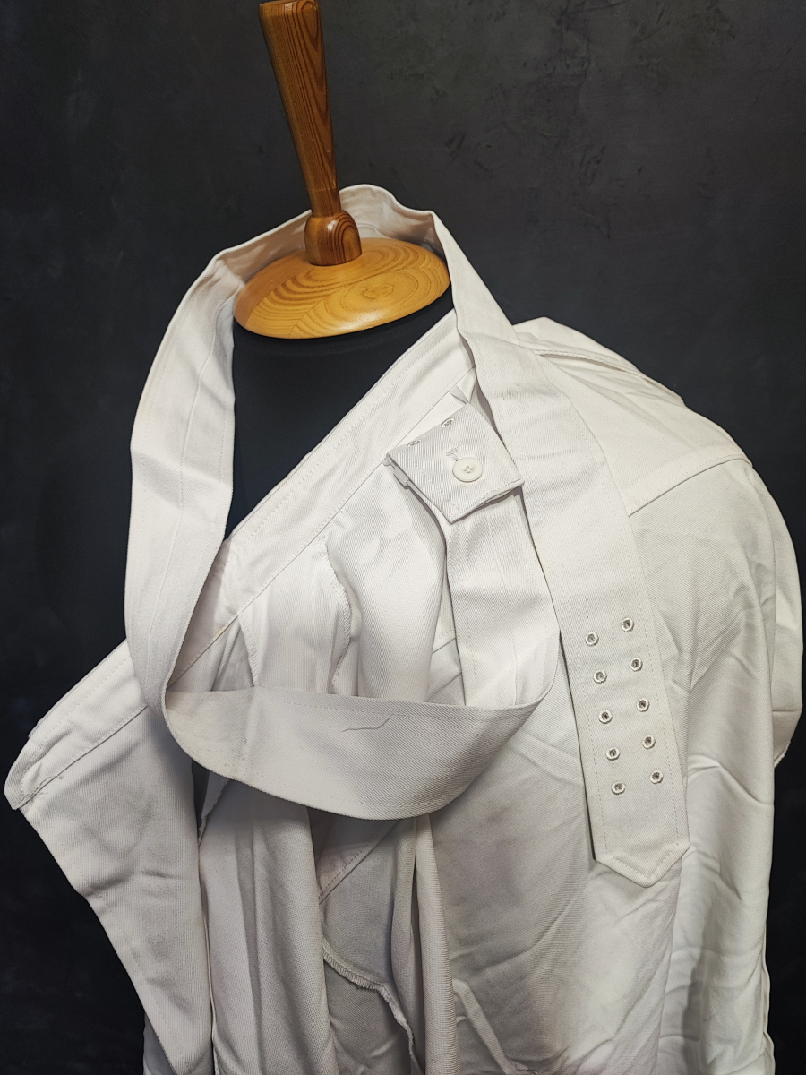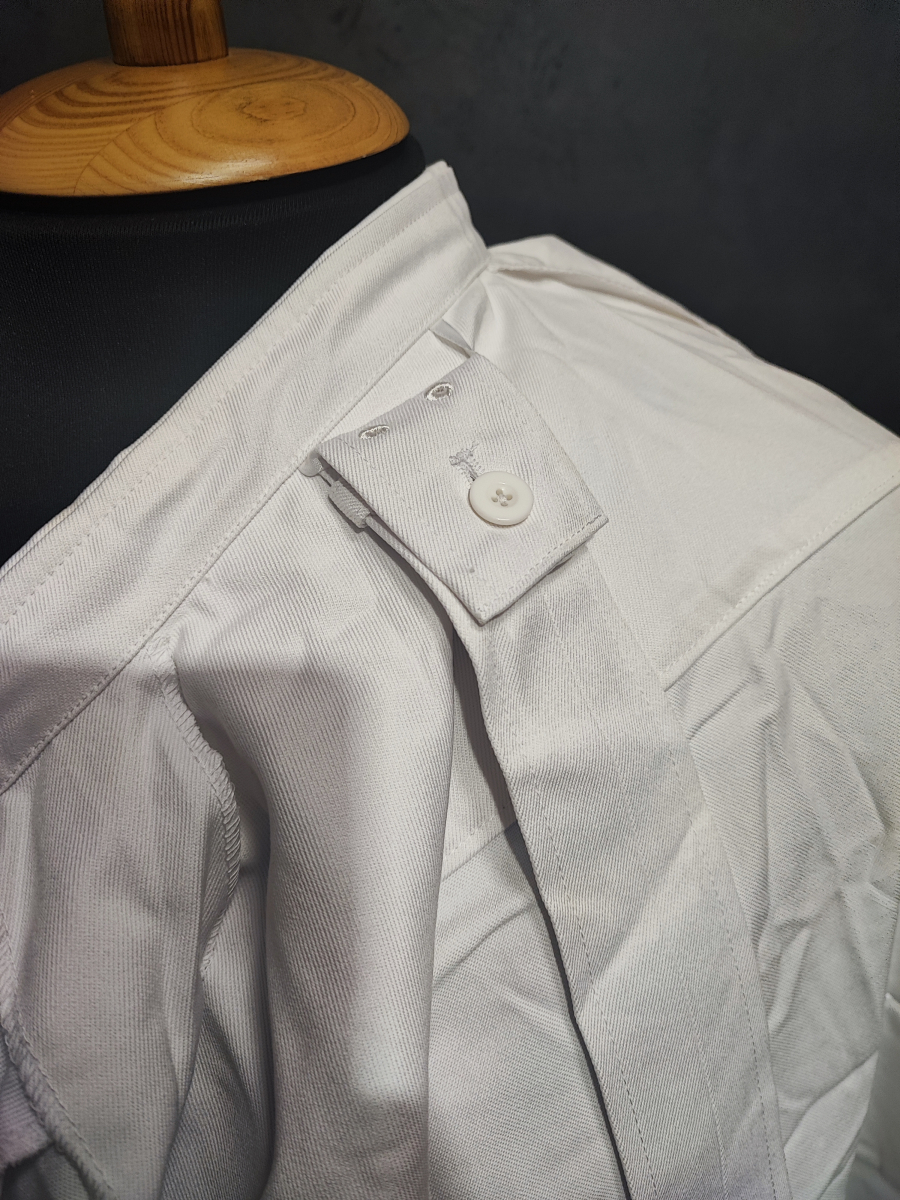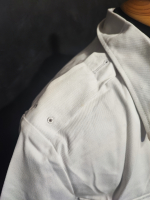 Достаточно редкая вещь у нас - вижу первый раз за 15 лет. На ebay такой стоит 10000 + доставка в состоянии БУ, а с пуговицами стоит больше 15000. Наш вариант без пуговиц. Правильнее сказать - без запонок. Там используются особенные пуговицы-запонки, которые не пришиваются, а продеваются на кольца через отверстия в ткани.