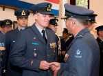 Тёмная лента с золотым орлом и короной — это нарукавный знак квалификации, обозначает, что военнослужащий является действующим военным лётчиком (пилотом).