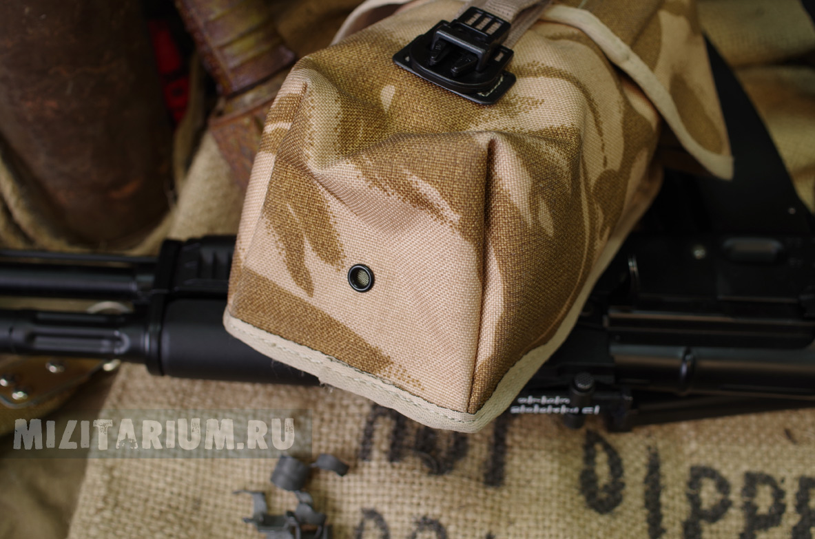 Подсумок закрывается интегрированной крышкой из прорезиненной кордуры, которая охватывает подсумок сверху, спереди, слева и справа, чтобы уменьшить возможность попадания сырости и грязи в мешок. Крышка фиксируется на подсумке липучкой размером 5 см х 5 см и внешним ремнем 25 мм с застежкой быстрого доступа. Внутренний мешок сжатия пришит к верхней части тела подсумка и имеет свой собственный шнурок cordlock. Это помогает сохранить содержимое в сухости и чистоте. Подсумок можно прикрепить к жилету или рюкзаку с помощью двух вертикальных жестких строп MOLLE, которые могут быть вплетены в основание с двумя горизонтальными ремнями MOLLE. Внизу вертикальные планки крепятся к корпусу мешочка на кнопки. Сливное отверстие есть в нижней части мешка.