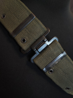 Идентичен, за исключением темно-оливкового цвета и люверсов вдоль нижнего края, позволяющих носить предметы в стиле американской разгрузочной системы того же периода истории. Эти ремни были в употреблении, но все еще находятся в очень хорошем состоянии.