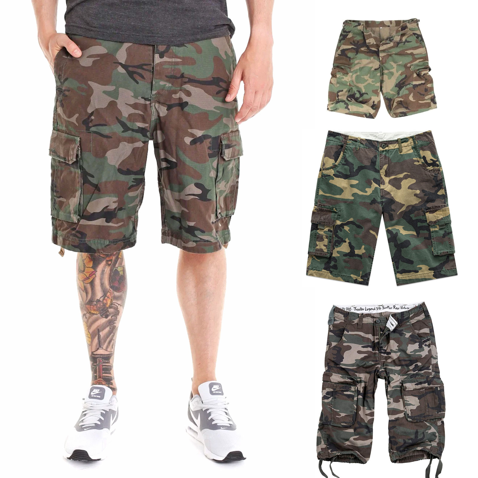 Разные модели камуфляжных шорт, бермуд и пиратов с грузовыми карманами.