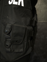 Множество карманов с клапанами на липучке и кнопке. Застегивается на молнию, по бокам стропы для регулировки объема.