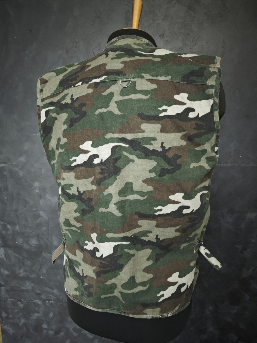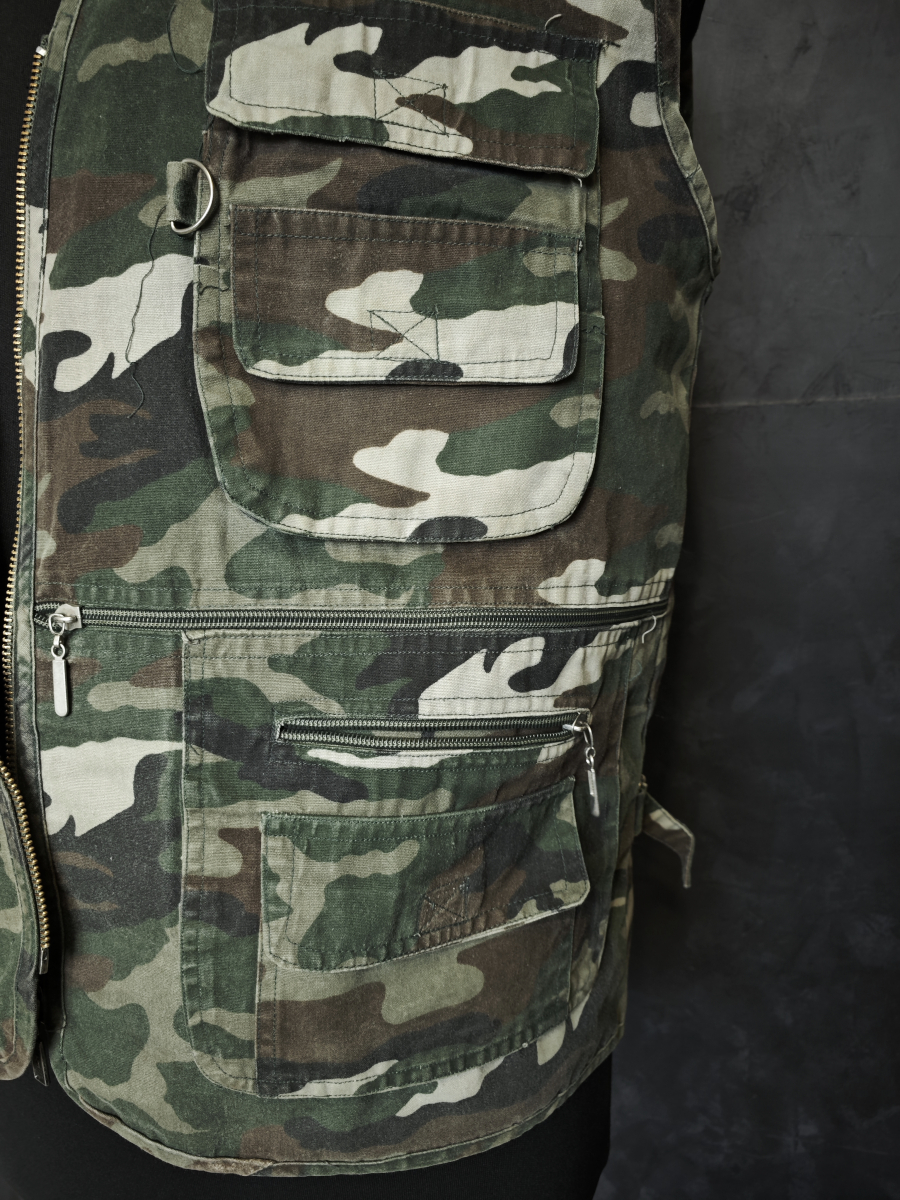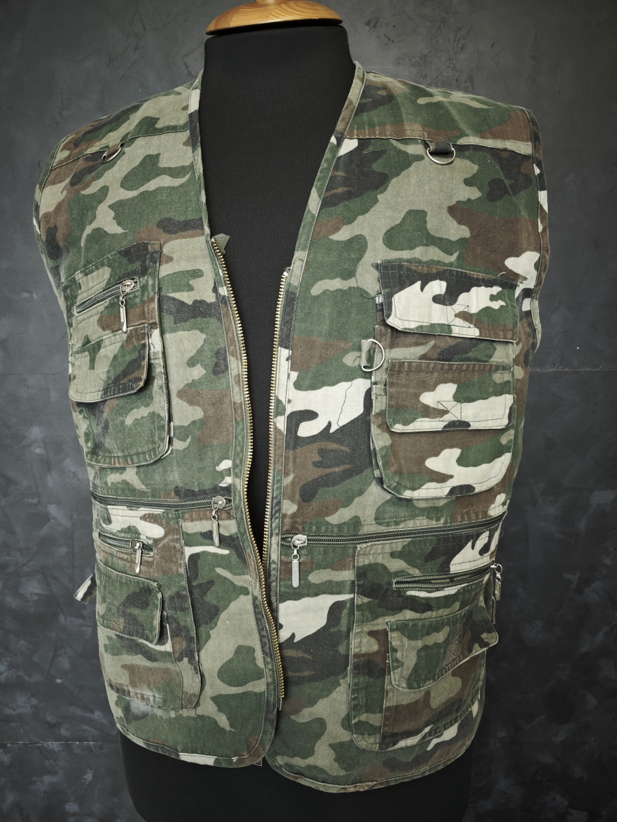Жилет рыболова в камуфляжной расцветке с большим количеством карманов.
