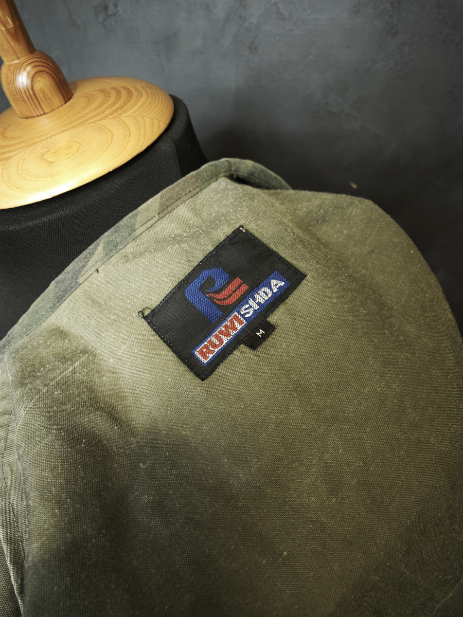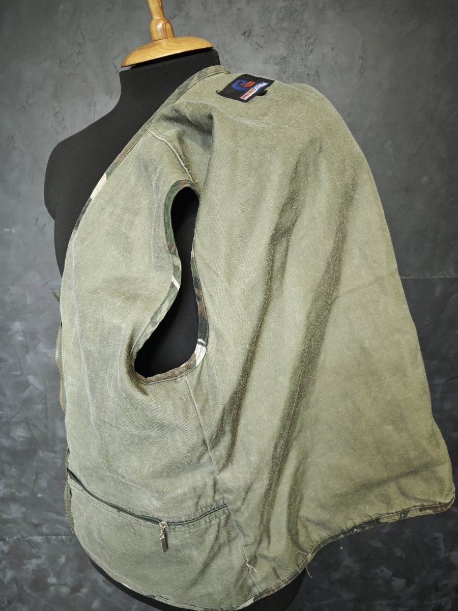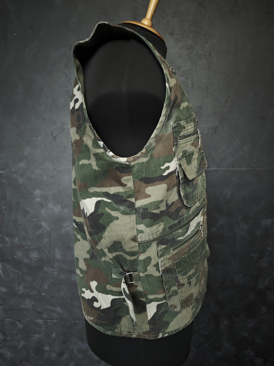 Жилет рыболова в камуфляжной расцветке с большим количеством карманов.