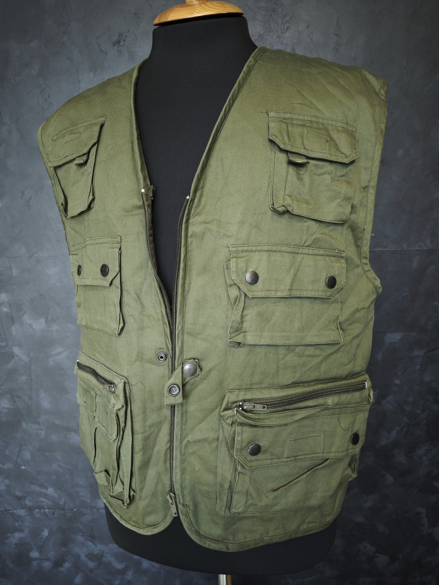 Летний жилет для рыбака и туриста из хлопковой ткани с большим количеством карманов.