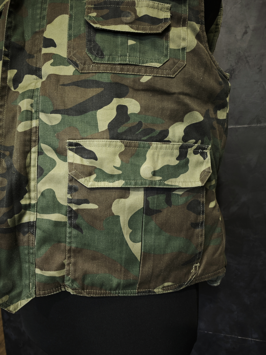 Утепленный жилет Vest в камуфляжной расцветке woodland с хлопковой подкладкой и синтетическим утеплителем.