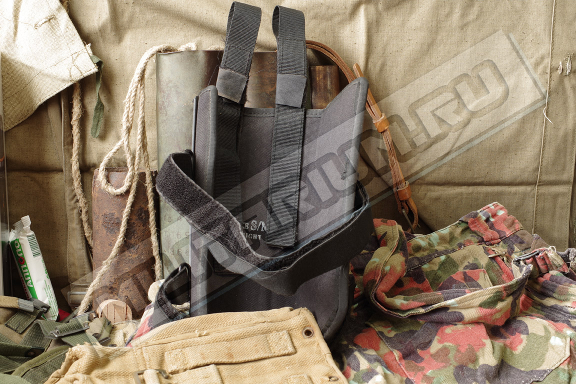 Крепятся на бедро двумя эластичными ремнями и к поясу.